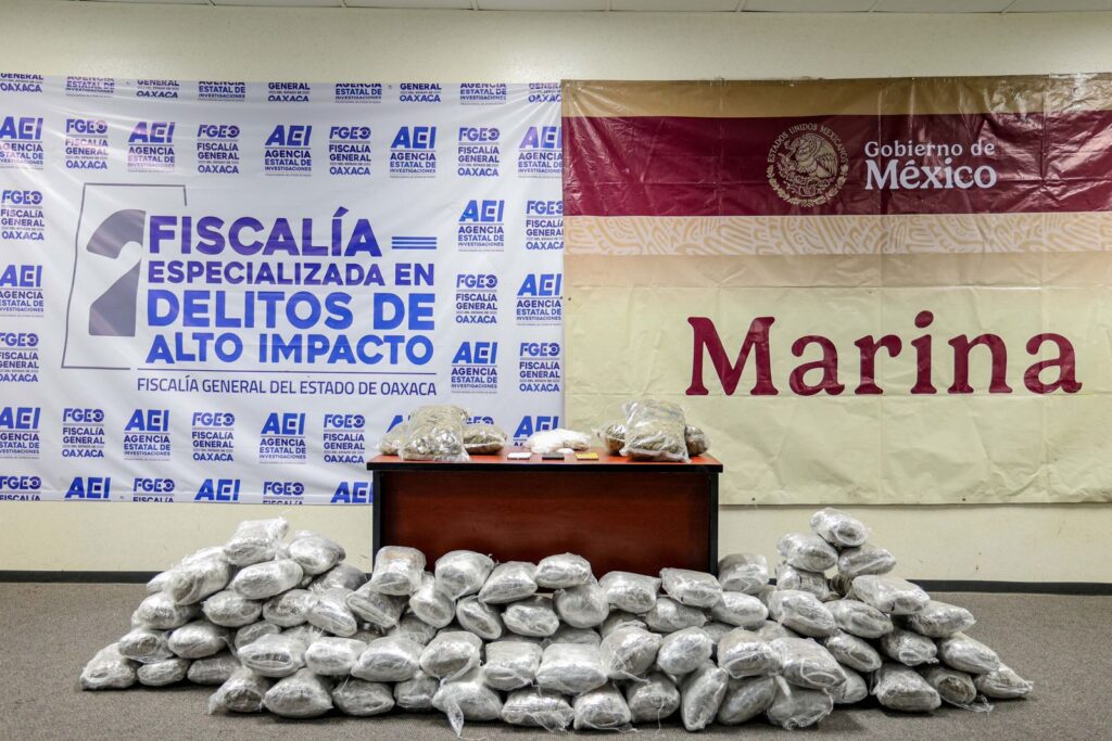Oaxaca de Juárez, Oax. 20 de octubre de 2025.- La Fiscalía General del Estado de Oaxaca (FGEO) realizó la detención de dos operadores de la célula delictiva del “Comandante Cromo”, además de lograr el aseguramiento de más de 100 kilogramos de drogas, durante un despliegue táctico que se llevó a cabo en el Istmo de Tehuantepec.