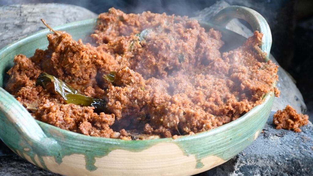 El proceso de elaboración, comienza con maíz criollo amarillo, cocido con ceniza, molido y mezclado con caldo de gallina criolla. A la masa se suman chiles guajillo, ancho colorado y chihuaque rojo, semillas tostadas, hoja de aguacate y hierba santa, hasta formar una mezcla espesa que se cuece a fuego lento en hojas de plátano, dentro del tapexco.