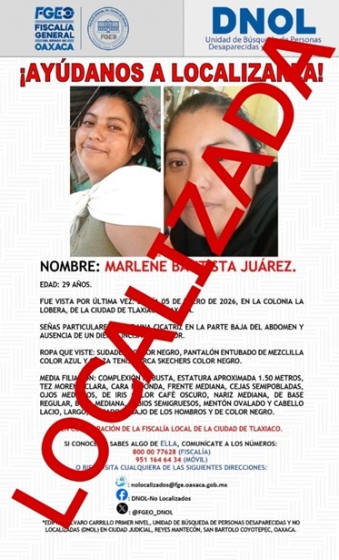 Oaxaca de Juárez, Oax., a 13 de enero de 2026.- Derivado de investigaciones integrales que consideran los contextos específicos de las víctimas, la Fiscalía General del Estado de Oaxaca (FGEO) localizó a cuatro mujeres -dos de ellas menores de edad- reportadas como no localizadas en distintas regiones de la entidad, quienes ya se encuentran con sus familiares. En todos los casos se trató de ausencias voluntarias; no obstante, se activaron de manera inmediata los protocolos de búsqueda y localización, lo que permitió dar con su paradero y garantizar su seguridad.
