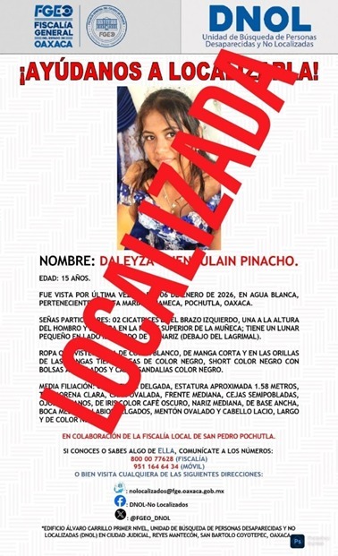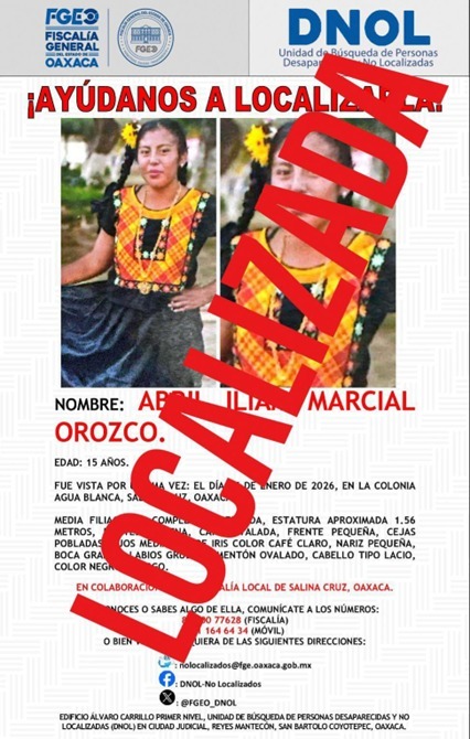 El primer caso corresponde a la adolescente A.M.O., de 15 años de edad, reportada como no localizada el 05 de enero de 2026 en Salina Cruz. Tras la denuncia, la FGEO inició los trabajos ministeriales y de campo que permitieron saber su paradero el 09 de enero en el domicilio de otros familiares, confirmándose que se trató de una ausencia voluntaria.