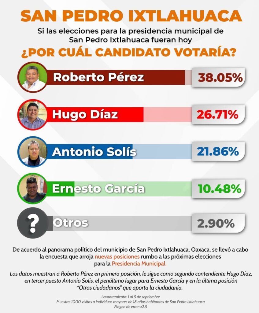 Oaxaca de Juárez a 24 de septiembre.- A unos días de llevarse el proceso electoral, de renovación del H. Ayuntamiento de San Pedro Ixtlahuaca, en encuestas que fueron realizadas por los equipos de campaña de los aspirantes a este cargo popular colocan a su contrincante, Roberto Pérez Delgado, en la cabeza.