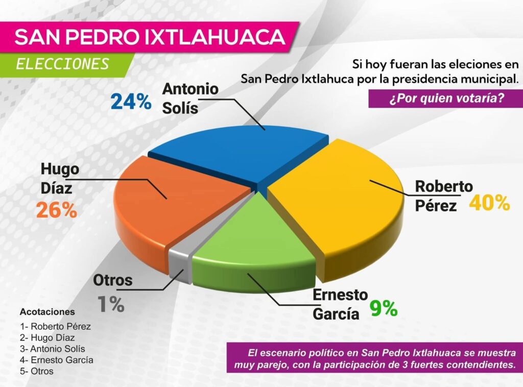 De acuerdo, a los dos procesos de valoración de aceptación efectuados por los dos aspirantes a primer concejal Hugo Diaz y Tony Solís, si hoy fueran las elecciones, colocan a Pérez Delgado en 40% de aceptación de la preferencia de las y los Ixtlahuaqueños., mientras que la segunda encuesta coloca a Roberto Perez Delgado en el 38% de aceptación.