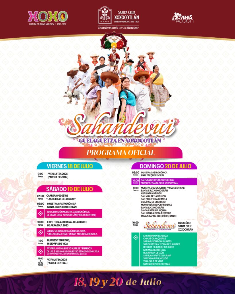 Santa Cruz Xoxocotlán, Oax., 11 de julio de 2025.- Durante julio, Santa Cruz Xoxocotlán presenta una de las celebraciones más esperadas del año: “Sahandevui, Guelaguetza en Xoxocotlán 2025”, un encuentro de hermandad, raíces, tradiciones y folclor que une a las ocho regiones de Oaxaca.