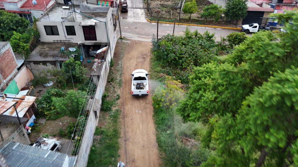 Por instrucciones de la presidenta municipal, Nancy Benítez Zárate, los equipos también realizan visitas a domicilios, escuelas y espacios públicos para nebulizar y tratar depósitos de agua, en una estrategia integral que combina fumigación y control larvario.