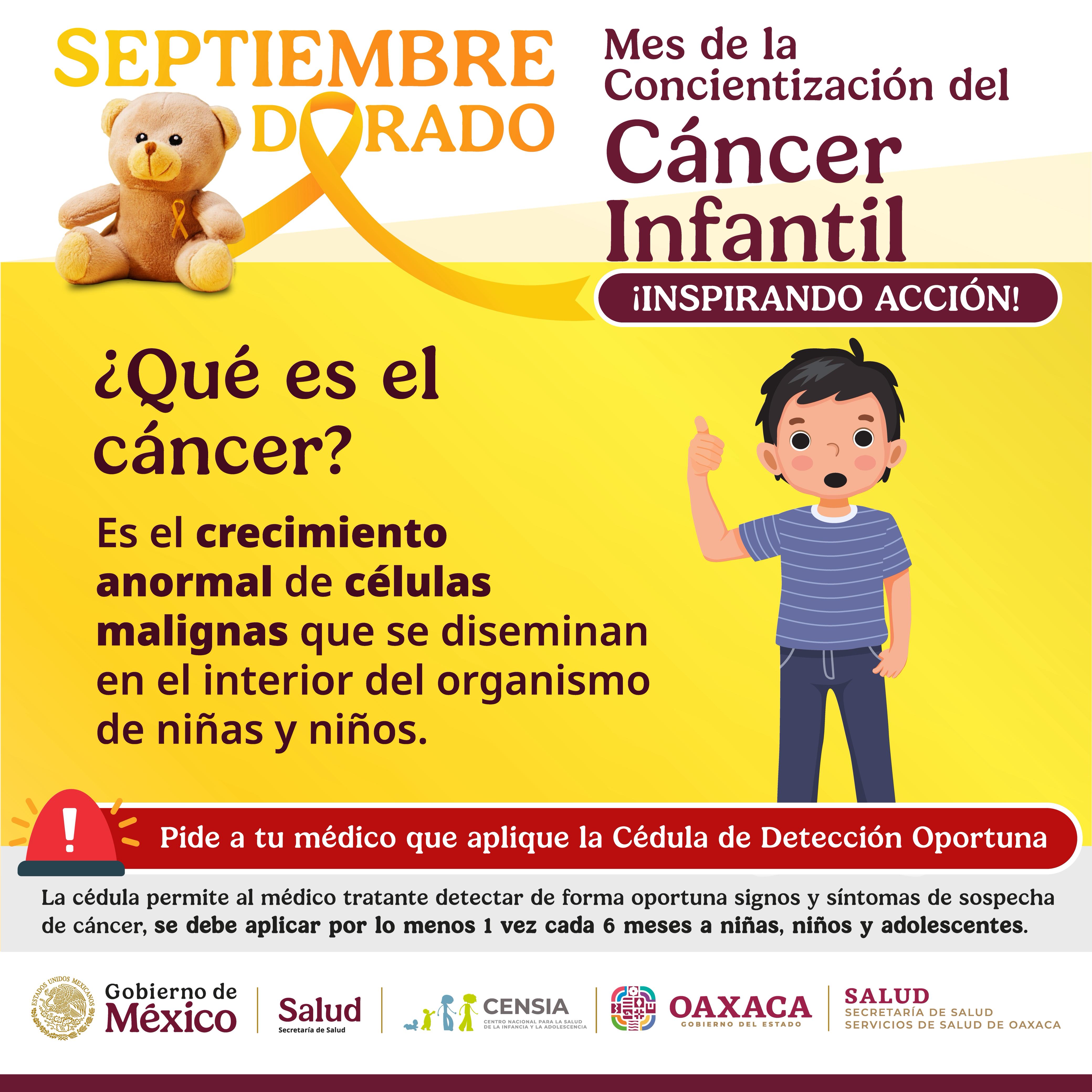 Oaxaca de Juárez, Oax., 2 de septiembre de 2025.- En el marco de Septiembre, mes de la Concientización del Cáncer Infantil; Servicios de Salud de Oaxaca (SSO) destaca la importancia de que madres, padres y docentes estén atentos a los signos y síntomas de esta enfermedad, ya que las mayores posibilidades de curación se alcanzan con un diagnóstico oportuno.