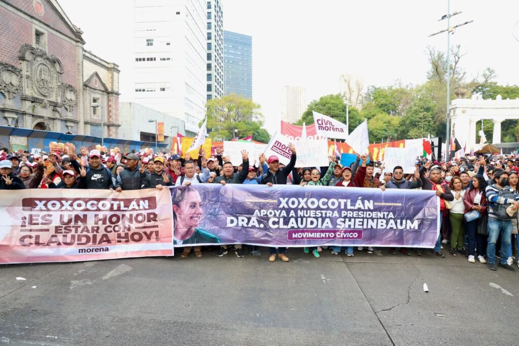 Ciudad de México, 06 de diciembre del 2025.- Integrantes del movimiento cívico de Xoxocotlán participaron este día en la conmemoración por los siete años de la Cuarta Transformación realizada en el Zócalo de la Ciudad de México, donde miles de personas de distintos estados acudieron para ser testigos de los resultados expuestos por la presidenta Claudia Sheinbaum.