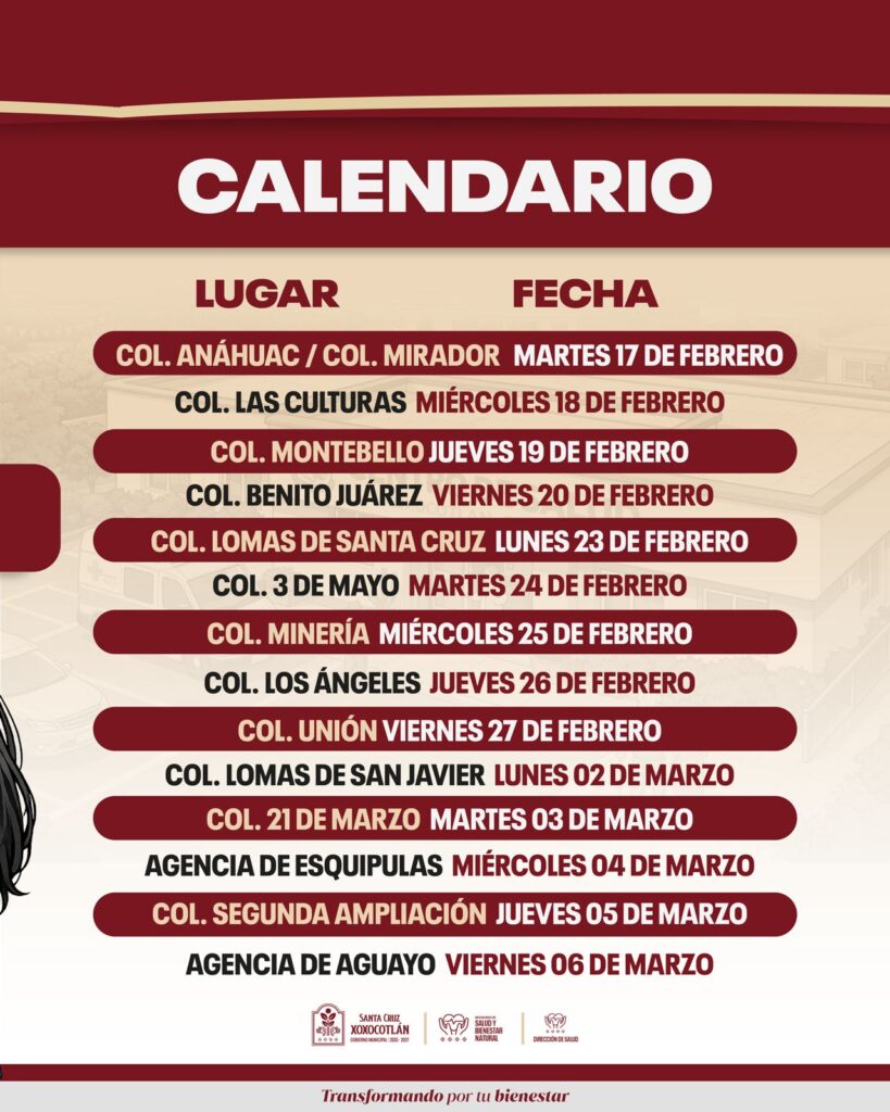 Para facilitar este proceso, el personal municipal visitará las Casas de Salud de Xoxocotlán en un horario de 09:00 a 14:00 horas en las siguientes fechas: